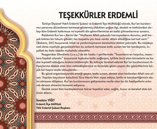 Türkiye Diyanet Vakfı Erdemli Şubesi Başkanlığı ve Erdemli İlçe Müftülüğü olarak, Kur’an kurslarımız yararına düzenlenen kermese göstermiş oldukları yoğun ilgi, destek ve katkılardan dolayı Tüm Erdemli halkımıza ve kıymetli din görevlilerimize en kalbi şükranlarımızı sunarız.