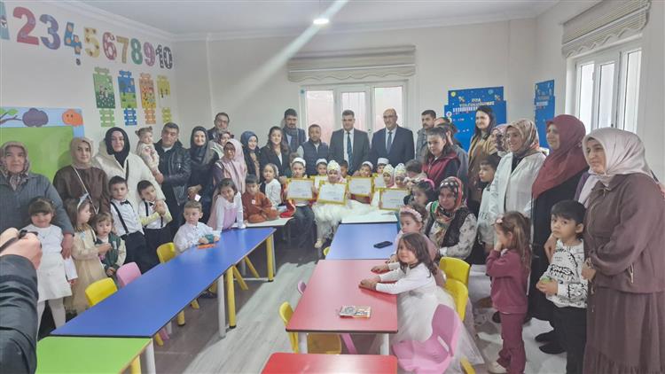 Program, Kur’an-ı Kerim tilavetiyle başladı. Tekbirler eşliğinde sahneye çıkan minik öğrenciler, Kur’an-ı Kerim tilavet ederek büyük bir heyecan ve mutluluk yaşadı. Duygu dolu anlara sahne olan programa İlçe Kaymakamı İsmail Şanal, İlçe Müftüsü Dr. Mehmet Sain, İlçe Vaizi Mahmut Kaplan, Murakıp Rasim Mercan, müftülük personeli ve öğrenci velileri katıldı.