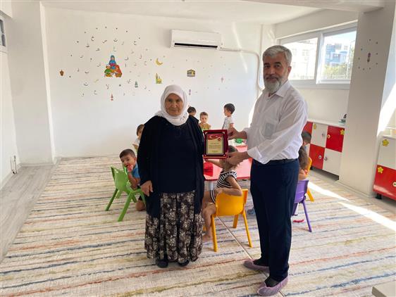 Mezitli İlçe Müftüsü Dr. Hasan Selam, Tece Yeni Camii Abdullah Ataş 4-6 Yaş Kur'an Kursunun Bu sene faaliyete geçmesinde büyük emeği olan hayırsever Ayşe Ataş'a Abdullah Ataş Kur'an Kursunda plaket takdim ederek teşekkürlerini iletti