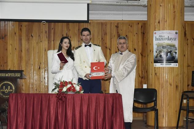 Merasim sonunda Tarsus Müftülüğü adına hazırlanan hediye, İlçe Müftüsü Murat Akçay tarafından çifte takdim edilerek kendilerine huzur ve mutluluk dolu bir ömür dilendi.